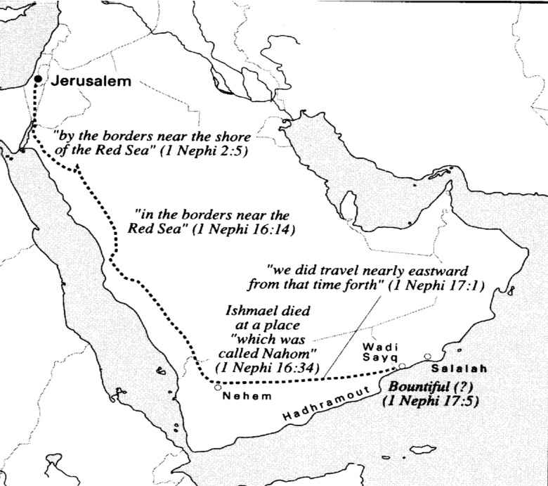 13b nearly a south-east direction Lehi's route in the old world is generally agreed upon by most Book of Mormon scholars. The map at the right is representative of general concensus. What is of particular interest here is that all agree that Lehi traveled generally in a 'south-east' direction along and parallel to the boarders of the Red Sea exactly according to the cardinal directions of the standard north, south, east and west. That is, the Joseph Smith translation here has got it right according to the known compus directions as stated in the Book of Mormon. The question becomes, why when in the 'old world' the directions in the Book of Mormon DO coincide with the true cardinal directions of north, south, east and west, do the limited geographic model proponents of Mesoamerica deem it necessary to altar the compus directions just so the Book of Mormon is in agreement with their personal concept of what the Book of Mormon geography must be? Here again we have the actual known geography supporting the four cardinal directions as given in the Book of Mormon without alteration, and only in the 'unknown' theorized model of the new world is it necessary for such as the Mesoamerican theoriest to change north to west, east to north, south to east and west to south. 14a we did take our bows and our arrows, and go forth into the wilderness to slay food In the true course of a real hunting trip of some days, the men left their families in Shazer and did go forth into the wilderness to slay food. How many days this first of many hunting expeditions did take is not a part of the highly abridged record. But this seems to be the primary purpose of this first stop to stock up on meat for the trip. 14b keeping in the most fertile parts of the wilderness There is an obvious reason that sojourners with supplies of seeds would stay in the 'most fertile parts of the wilderness' and that is from time to time to spend a planting and harvesting season in growing a supply of various other foods other than just meats. 14c which were in the borders near the Red Sea At least the first couple of growing season and at least two years was spent in traveling the borders of the Red Sea. This makes sense because the women would be with child from time to time, hopefully delivering during the growing seasons. 15a we did travel for the space of many days, slaying food by the way This first year of travel did proceed with only momentary stops to hunt food along the way until the 'rainy' and planting season would come again. |
