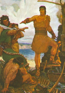 Lehi's party of the family of Ishmael, the family of Lehi and Zoram have traveled 8 years in the wilderness from the Valley of Lemuel to this site they call Bountiful—After establishing themselves at this site, the Lord commands Nephi to build a ship—Nephi's brethren at first oppose him—Nephi exhorts them by recounting Isreal's history under God—Also Nephi is filled with the power of God and his brethren who again attempt to resist him by force are forbidden to touch him lest they whither as a dried reed—His brethren conform to God's commands, aid in the building of the ship and are again allowed to touch Nephi. [About 592-584 B.C. for the 8 year journey from the Valley of Lemuel to the first land Bountiful][About 584-582 B.C. in that Bountiful to smelter ore, forge tools and then build the ship] |