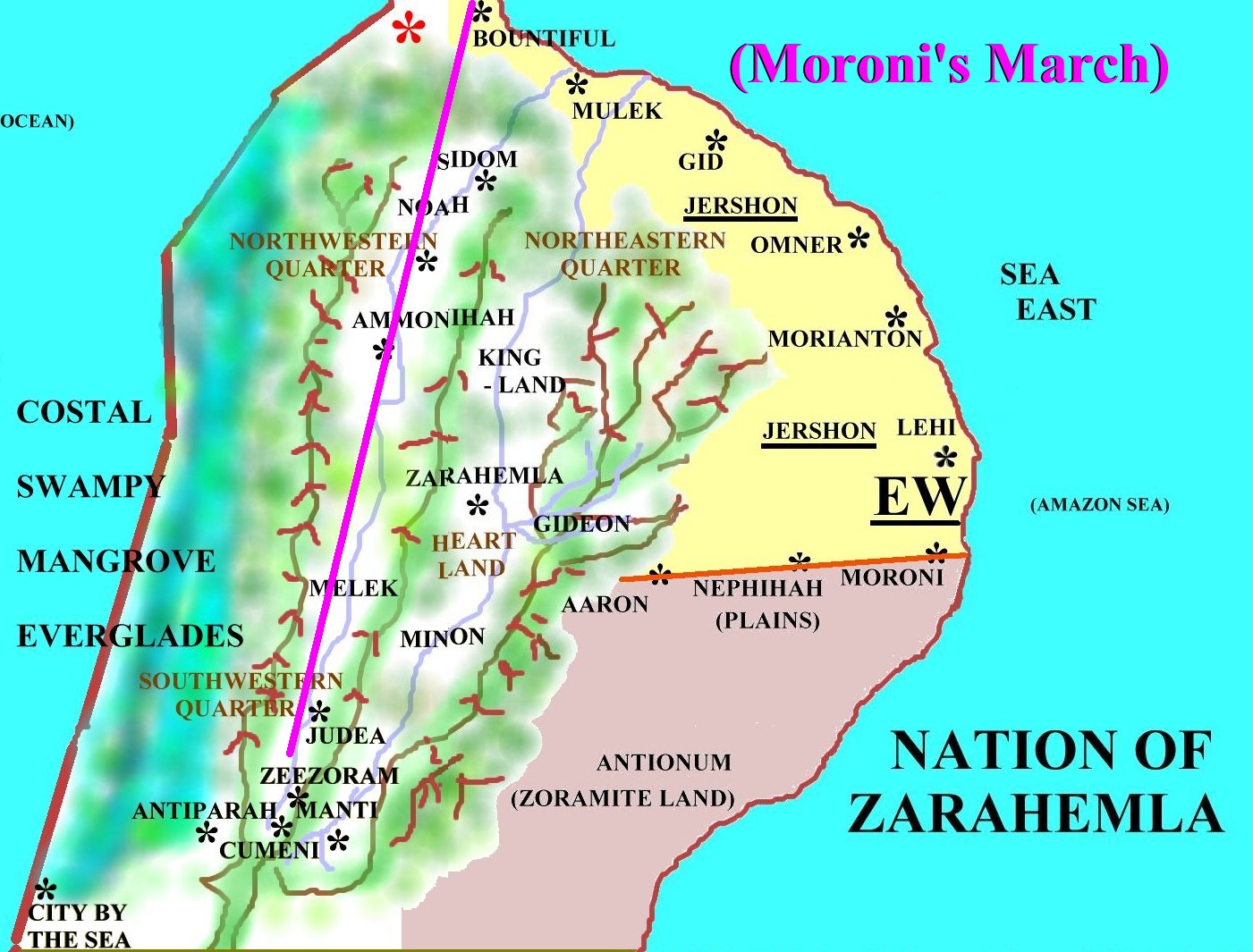 | 15a had begun his march toward the land of Bountiful Now from the southwest quarter of the land from Manti to the west sea of such cities as Cumeni, Zeezrom, Antiparah, Judea and others, the most direct route would have for Moroni to march down the western parallel valley which would pass through the lands of Melek and Ammonihah and thus on to Bountiful, being entirely undetected by the Lamanites in the city of Mulek. Thus fact would likely come into play in Jacob's decission to pursue the little army of Teancum, for if Jacob had known that the armies of Moroni were in he land, he certainly might not have been so easily enticed to be drawn out against Teancum. As an added note, the last we had heard of Lehi was that he was protecting the city of Noah. If Lehi was thus still employed, it does seem that Moroni upon this march which did so pass by Noah, had picked up Lehi from that assignment and included him and his army in Moroni's march unto Bountiful to engage the Lamanites where they had entrenched themselves. Certainly the city of Noah was no longer being threatened at this particular time. |