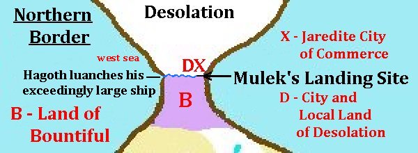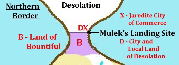 THE NORTHERN BORDER: Now in summary, the northern border of the nation of Zarahemla is the provincial land of Bountiful which on the north borders the Land of Desolation of the Jaredites. It is where the Jaredites built a great city of trade and commerce. It is were Mulek's party first landed finding Coriantumr. It is where Mormon would lead the Nephites in their defense against the Lamanites in the local land of Desolation from a Nephite fortress city of Desolation.