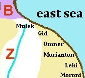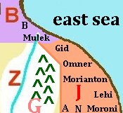 When on his missionary tour of the regional provinces of the land of Zarahemla, Alma, first time he was thrown out of Ammonihah, was on his way to the next provincial land whose capital city was Aaron. He had visited the provinces of Zarahemla, Gideon and Melek with success. The capital city of the province of Ammonihah had expelled him from the land. And he was going over to the province where Aaron was the chief city when an angel stopped him and told him to return to Ammonihah. We never again hear of Alma going to the province where Aaron was the capital city. Why not? Well after Alma finished in Ammonihah the second time, he went home to rest with Amulek. Then the Lamanities came in and destoryed Ammonihah. The other Nephites repell those Lamanites and the next actual mission we here Alma traveling to is south to Manti and when on his way there he meets the returning sons of Mosiah from their Lamanite missions with the converted Lamanites in tow. After all the discussion the Nephites give the land or province of Jershon to the Lamanites. There is reason to believe that the city Aaron was the capital city of that province as it is so located on what would be the south of Jershon on a line with Nephihah and Moroni so protecting the new southeastern Nephite border. Remember the Zoramites of Antionum defected and became Lamanites and thus the province of Antionum defalted to and became part of the national lands of Nephi of the Lamanites. From the city of Aaron, Moroni had set up a defense line to the east sea coast with the new cities of Nephihah and Moroni and then round about upon that sea coast with the cities of Lehi, Morianton, Omner Gid and Mulek to Bountiful. The only question is where does the line between Bountiful and Jershon fall? A presumption must be made and all the defensive cities as shown on the map at the left will be illustrated as falling in the province of Jershon except for Mulek and of course the city of Bountiful itself.Now the 'A' and the 'N' before the city of Moroni on the map are of couse for the cities of Aaron and Nephihah. They would make a line, set by captain Moroni, of defense upon the southern border of Jershon alone that border with Antionum, which had fallen away to the Lamanites as the land of the defecting Zoramites. Some will attemp to divide the city of Nephihah from the plains of Nephihah, but as Alma 62:18 establishes, they are of the same land, city and plains area. The joining southeastern border of Bountiful is now estabished as ajoining or bordering with that of northern Jershon. As depicted in the small map at the right, the cities of Gid, Omner, Morianton, Lehi, Moroni, Nephihah and Aaron have been assigned to this provincial land. Mulek on the other hand has been assigned to the province of Bountiful and as depected is associated with the river Sidon. Remember the Mulekites may have accessed the interior of the land south by waterway, the river Sidon up and into the land to where they built and established Zarahemla. Whether the city Mulek was so also established by the Mulekites as one of their cities, we do not have that information in the Book of Mormon, but the name Mulek itself does suggest it. As for the 'G' and the little green mountains, remember both the Sidon river would have been in a water basin within mountains and the land of Gideon is so stated as a valley between mountains running off to the east from the Sidon drainage valley. |