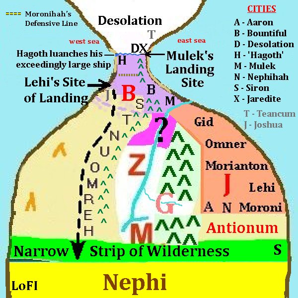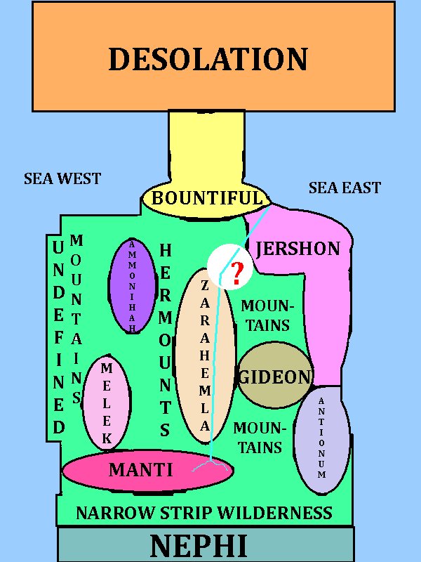 All that was spoken of in Alma 22:27-29 before the introduction of Bountiful at the very end of verse 29 is south of that land they called Bountiful. That is the provincial land and city of Zarahemla, Manti, the western wilderness, the eastern wilderness, the river Sidon, the Narrow Strip of Wilderness, the land of First Inheritance and of couse the Land, Nation and city of Nephi. In fact one picture painted concerning Bountiful is that it is like the 'cork' of a corked jug. All that is in the national Land of Nephi and the national Land of Zarahemla, excepting Bountiful, is south of and contained in that 'jug' of land surrounded by water. In other words the land bridge of Bountiful, its small narrow neck of land, is the only land route out of the lands of Zarahemla and Nephi. And as painted in this verse, the nation of Zarahemla at this juncture of time is nearly surrounded by the Lamanites, who are then also surrounded by water with the exception this land Bountiful which runs from the east sea to the west sea and stops up the 'jug' of land. Of course this is but the 'general picture' and as in all generally set out matters there are details not given in the general perspective.From the Book of Mormon's perspective a river has two heads or ends. One head is where the river begins and the Sidon's head waters in that respect begin in the land of Manti. The other head is actually the 'mouth' of the river and is where the river empties into the sea. So what is being said in verse 29 is that the national land of Zarahemla ran from the Sidon's head waters in Manti on the south and down north including the lands from east to west as so previously delimited to Bountiful on its north which stopped up the land and confined it from sea east to sea west in its land 'jug' surrounded by water. As the Book of Mormon never mentions any other persons other than those of Lehi and Mulek and the Jaredites which became extinct, despite various external opinions, and the fact that the Jaredites had maintained the land southward as a natural wilderness preserve, we must presume that prior to Lehi's and Mulek's landing the whole of the land south was but a wilderness. By the time of Alma, certain community settlements had been established variously 'dotting' the wildernes with pockets of civilization. We have so mentioned seven or eight such provincial 'pockets' of lands so situated in the nartional lands of Zarahemla. But it ought to be mentioned that between these provincial centers with their associated cities and towns, the wilderness still existed and 'surrounded' and 'divided' in most cases these provinces as indeed mountain ranges and other physical features of the once entire wilderness still wove an interconnected famework of wilderness housing these population centers. When Alma went to Gideon, it was in a separate valley which ran away east from the Sidon valley. When Alma went 'over' and 'into' the land of Melek west of the provincial land of Zarahemla, it too represented the western Sidon valley range being crossed and then into that parallel valley which would house the provinces of Melek and Ammonihah. What was between these provinces? Mountains and wilderness, the western mountain range of Sidon between Zarahemla and Melek. Three days of likely down river travel through wilderness from Melek to Ammonihah. And to the west and north of the province of Zarahemla, besides these two exceptions of the pocketed provinces of Melek and Ammonihah, was primarily were the wilderness remained called Hermounts, the wilderness of the mountians containing the wild beast, 'away beyond the borders of the land'. This geological feature of Hermounts, that wilderness west and north which did still predominate, was of necessity north between Bountiful and Zarahemla. Southern Bountiful actually being a part of it. Now if the Sidon River was a chief navigable river, it and its banks and shores would carve a natural pathway through such wilderness where pockets of some degree of civilization could be established almost continuously to the sea. And if Hermounts was that continuous wilderness north and west of Zarahemla, then the river pathway of Sidon logically passed to the east of it and thence to the sea. This is why in Helaman 1:28 it states that Moronihah 'sent forth Lehi with an army ROUND ABOUT to head them (Coriantumr's Lamanites) before they should come to the land Bountiful.' Lehi did not travel 'round about' in the wilderness of Hermounts to Bountiful, but 'round about' by way of Sidon river passage toward the sea and then thence toward Bountiful in order to head or stop the Lamanite invasion. And since Coriantumr's invading Lamanites were progrssing through the 'capital parts of the land' taking time to slaughter men, women and children of many cities and strongholds, it paints a picture of a very populated land trailing northeast along the Sidon river course northeast above Zarahemla. And this land 'between' Bountiful and Zarahemla, NOT Hermounts the wilderness directly north of Zarahemla, but that land between which followed the course of the Sidon river pathway 'round about' northeast and then along that sea shore between Mulek and Bountiful was most likely another land and province which bordered the land of Bountiful's southern border. Now as to whether our mystery "?" land was just 'near' or bordered against the lands of Bountiful and Zarahemla we will leave as to the diference in time and development of lands as the description in Helaman 4:5's of about 38-30 B.C. and 3 Nephi 3's times of 16-18 A.D. (some 50 years) may account for the fact of when it actually came to border Bountiful. But by Mormon's day, it was one continual concourse of civilized occupation when 'the whole face of the land had become covered with buildings' (Mormon 1:7). Now thus, depending upon points and times of developmental evolution, the southern border of Bountiful may be meagerly represented as share borders with Jershon on