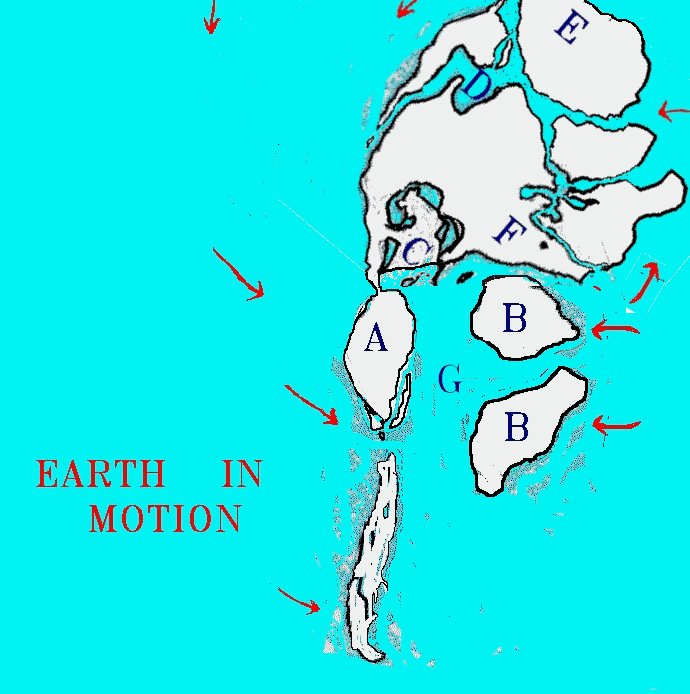 The operative words here seems to be 'turned back.' This should not bea surprising description as the surface of the earth is that of a sphere andlines of motion just cannot be straight out into space, the must be of acurved nature to begin with. And as the earth rotates, a turning curved pathof lands that are in motions away from each other seems to be more of anunderstandable nature than that of just a perfectly straight plotted line.This seems to be suggested by the previously seen animated 'gif' above whichis crude but such a turning motions of the lands in their division patternscan be detected.