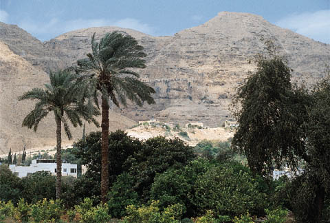 This photograph shows vegetation in present-day Jericho. Anciently it was a walled city in the valley of the Jordan River, 825 feet below sea level. It is a rich agricultural area where date palms and citrus groves flourish. In the background is the traditional Mount of Temptation (Matt. 4:1-11).