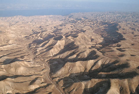 Looking southeastward over the Judaean wilderness. Visible in the background is the Dead Sea.