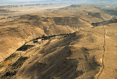 This is a northeastern view of the great desert valley (also called a wadi) where Kadesh-barnea is situated. The stream that flows here during the rainy season makes this a well-watered and fruitful spot in the wilderness of Zin.
