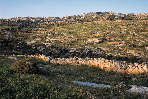 This photograph shows rocky hills and shepherds fields in the foreground, with the modern city of Bethlehem in the background.
