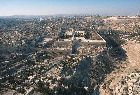 Looking northward. In the center of the picture is a Muslim shrine with a gold-covered dome, called the Dome of the Rock. The Jews worshiped anciently in temples located here. The walls near the Dome of the Rock surround the old city of Jerusalem. On the right of the wall is the Kidron Valley. On the far right is the Mount of Olives. To the north, beyond the Dome of the Rock, is the traditional Golgotha, or Calvary.